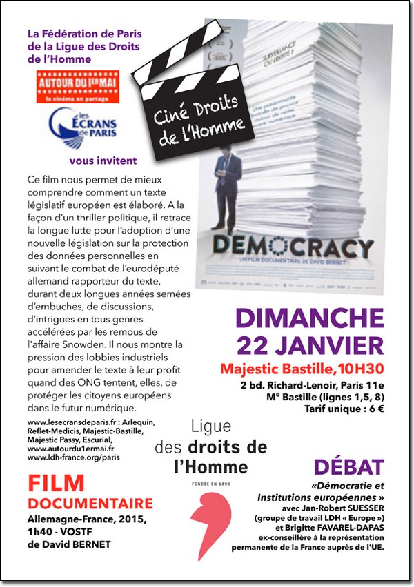 La projection sera suivie d’un débat "Démocratie et institutions européennes" en présence de Jan-Robert Suesser (groupe de travail LDH "Europe"), et de Brigitte Favarel-Dapas, ex-conseillère à la représentation permanente de la France auprès de l’UE.