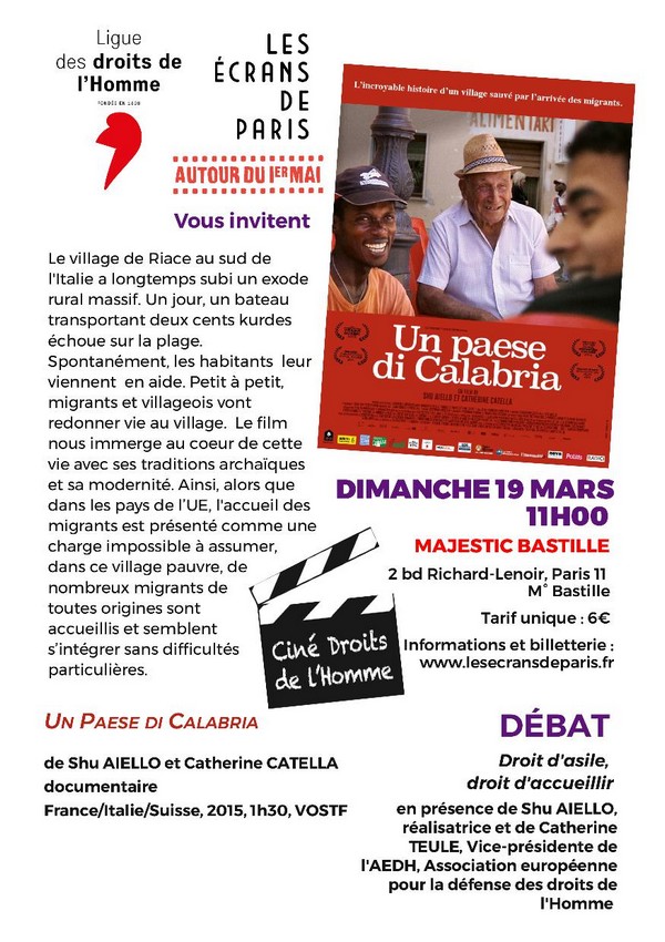 La fédération de Paris de la Ligue des Droits de l’Homme et Autour du 1er mai vous invitent à une projection rencontre exceptionnelle autour du film Un Paese di Calabria, de Shu Aiello et Catherine Catella, dans le cadre des rendez-vous Ciné-Droits de l’Homme.