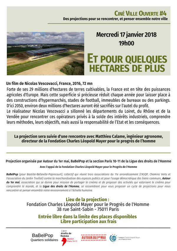 La projection sera suivie d’une rencontre avec Matthieu Calame, ingénieur agronome, directeur de la Fondation Charles Léopold Mayer pour le progrès de l’homme. Nous pourrons évoquer avec lui notamment le projet Europacity, qui menace une grande étendue de terres agricoles au Nord de Paris.
