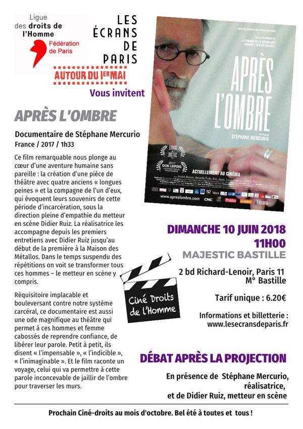 La fédération de Paris de la Ligue des Droits de l’Homme et Autour du 1er mai, avec les Écrans de Paris, vous invitent à une projection rencontre exceptionnelle autour du film Après l’ombre, de Stéphane Mercurio, dans le cadre des Ciné-Droits de l’Homme.