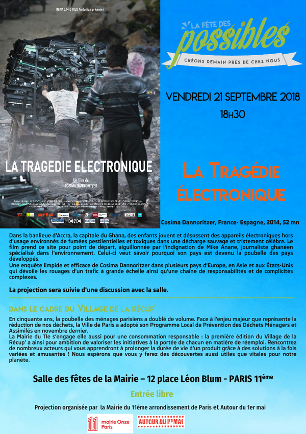Vendredi 21 et samedi 22 septembre à la Mairie du 11ème, rendez-vous au premier Village de la Récup’, pour rencontrer de nombreux acteurs et apprendre à prolonger la durée de vie d’un produit grâce à des solutions à la fois variées et amusantes ! Nous nous associons à cet événement en vous proposant vendredi la projection du film La Tragédie électronique, de Cosima Dannoritzer, à 18h30 en salle des fêtes de la Mairie du 11ème. La projection sera suivie d’un débat.