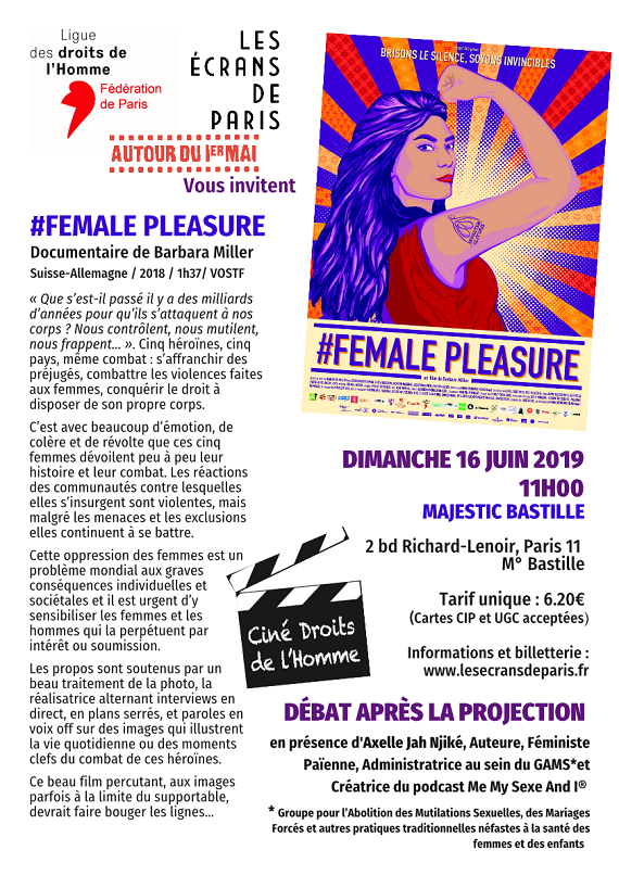 La fédération de Paris de la Ligue des Droits de l’Homme et Autour du 1er mai, avec les Écrans de Paris, vous invitent à une projection rencontre exceptionnelle autour du film #Female pleasure, de Barbara Miller, dans le cadre des Ciné-Droits de l’Homme.