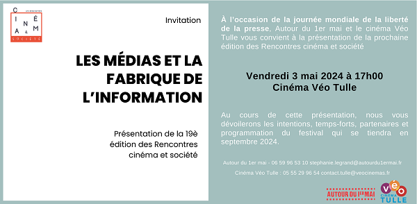 A l’occasion de la journée mondiale de la liberté de la presse, Autour du 1er mai et le cinéma Véo Tulle vous convient à la présentation de la prochaine édition des Rencontres cinéma et société. Au cours de cette présentation, nous vous dévoilerons les intentions, temps-forts, partenaires et programmation du festival qui se tiendra en septembre 2024.