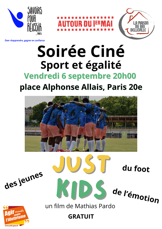 Durant une semaine au mois de juillet, nous avons vu avec le groupe plusieurs films sélectionnés par Autour du 1er mai : des fictions, des documentaires, des courts et des longs métrages. Après de nombreuses discussions, le groupe a finalement choisi de projeter au public du quartier le film documentaire Just kids, de Mathias Pardo.